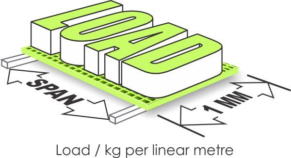 | Span | Depth | Mesh | Load / kg per linear metre | |||||||||||